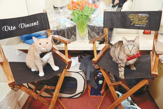 3月20日,在美國紐約,兩只在百老匯新版舞臺劇《蒂凡尼的早餐》中出演的“貓演員”維托·文森特(左)與切西在化妝室中接受拍照。