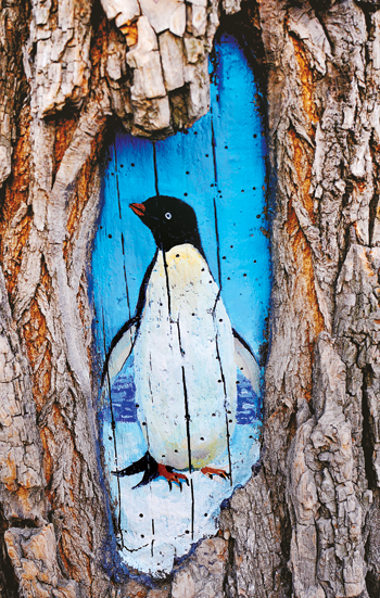 近日,走紅于網(wǎng)絡(luò)的“樹洞女孩”王月帶著11位熱心環(huán)保公益事業(yè)的“扮美志愿者”在大連市西崗區(qū)正仁街兩旁的樹上進行創(chuàng)作。據(jù)悉,王月寒假過后就帶領(lǐng)同學們在學校附近的居民區(qū)中墻壁上進行創(chuàng)作。她夢想能帶領(lǐng)更多的繪畫者,畫遍大連的街區(qū)、角落,希望有更多的“扮美志愿者”加入到“扮美大連”的隊伍中。圖為王月公益團隊里的一位繪畫者在一棵大樹的樹洞上繪畫的企鵝。