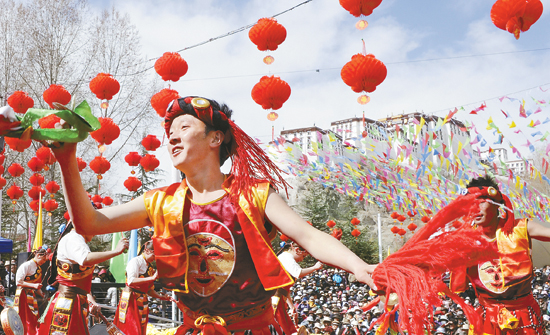 3月28日,西藏各地舉行活動,慶祝西藏百萬農奴解放54周年。圖為農民藝術團演員在拉薩街頭表演《歡騰的熱巴》。