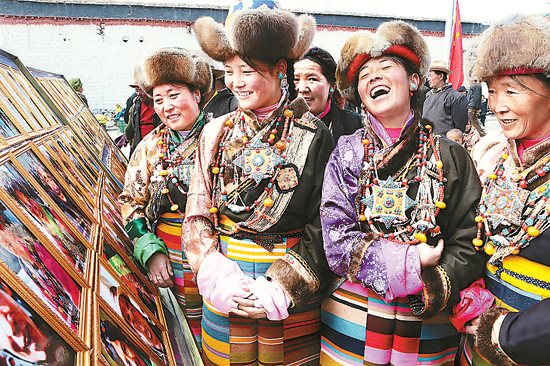 西藏文聯(lián)、西藏攝影家協(xié)會聯(lián)合日喀則地委組織部和第六批山東援藏干部管理中心,近日在日喀則地區(qū)白朗縣吉定村舉辦攝影展,慶祝西藏百萬農奴解放54周年,受到當?shù)卮迕駸崃覛g迎。此次展覽展出120余幅圖片,是西藏攝協(xié)從攝影家、山東援藏干部楊國瑩兩年多深入吉定村跟蹤拍攝的數(shù)千幅照片中精選出來的,從一個側面反映了西藏全區(qū)加強基層黨組織建設、民族團結、和諧穩(wěn)定、發(fā)展經(jīng)濟、建設社會主義新農村等方面的新發(fā)展新變化。活動期間,主辦方還向村委會贈送了畫冊年歷和體育用品。圖為村民們看到展覽照片后樂不可支。 文/何見遠 圖/車 剛