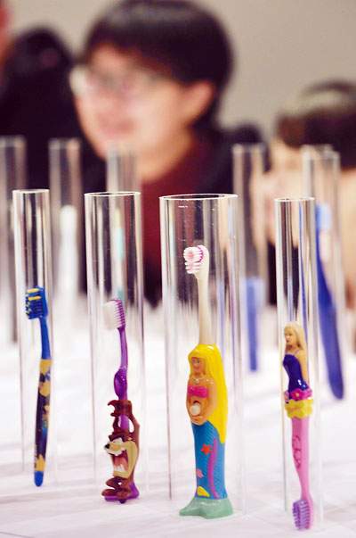4月6日,臺灣淡江大學建筑系副教授吳光庭在臺北市大稻埕舉行“光庭與他收藏的牙刷們”設計展。300多只牙刷或“站立”或懸吊,為參觀者帶來一場奇幻的牙刷文化之旅。圖為參觀者在欣賞吳光庭牙刷設計展上的牙刷。