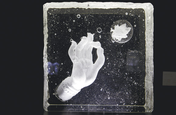 4月23日,“琉璃之人間探索——楊惠姍、張毅聯(lián)展”亮相中國美術(shù)館。展品包括楊惠姍的“一朵中國琉璃花”“無相無無相”“更見菩提”和張毅的“焰心禪心”“自在”等5大系列近50件新作。圖為聯(lián)展上的琉璃作品《菩提花開》。