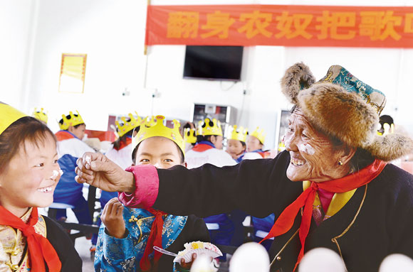 3月28日是“百萬農奴解放紀念日”,很多藏族群眾把這天稱為自己的又一次“生日”。3月26日,西藏山南地區貢嘎縣崗堆鄉中心小學328名學生和64歲的老阿媽卓瑪拉姆一起唱歌跳舞、吃蛋糕,迎接“百萬農奴解放紀念日”到來。今年64歲的卓瑪拉姆,小時候和千千萬萬的“農奴”一樣,過著衣不蔽體、食不果腹的生活。她向孩子們講述了自己作為“小農奴”的悲慘故事,希望孩子們珍惜今天的幸福生活,好好學習,要做一個懂得感恩的人。
