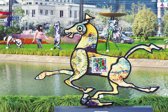 “萬馬奔騰中國夢——2014微彩繪新藝術實驗展”近日亮相上海陸家嘴中心綠地公園。由108位知名藝術家、設計師及數十家藝術機構聯合推出108匹裝置藝術馬作品,全新呈現了“微彩繪”這一最新藝術表現形式和“彩繪碼”等移動互聯網技術。觀眾可用智能手機掃描實現互聯網的鏈接與互動。圖為市民和游客在上海陸家嘴中心綠地參觀體驗。