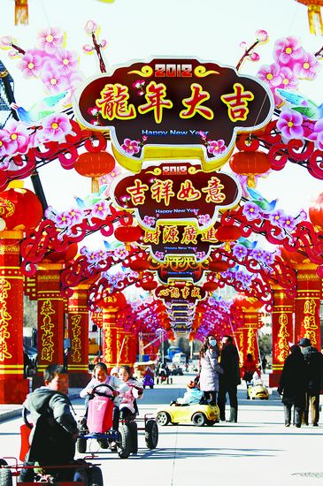 1. 1月15日,距離龍年春節還有一周時間,西寧市各大廣場的迎新春龍年花燈大多 已安裝完畢,圖為市民在龍年花燈牌坊下觀賞游玩。新華社記者 王博 攝