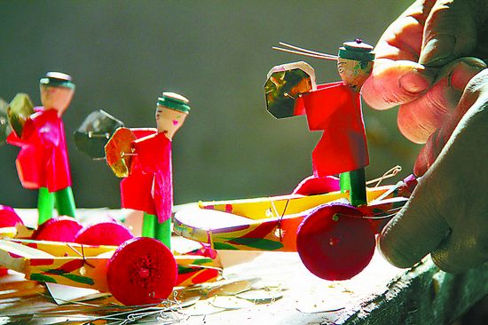 3. 春節臨近,山東省臨沂市郯城縣的木旋民間藝人們忙著趕制燕車、小人車、金龍 刀等各式木旋玩具,供應當地的年集和春節廟會市場。圖為1月15日,山東省臨 沂市郯城縣港上鎮樊埝村75歲的樊安生老人在制作“小人車”。新華社發 張春雷 攝