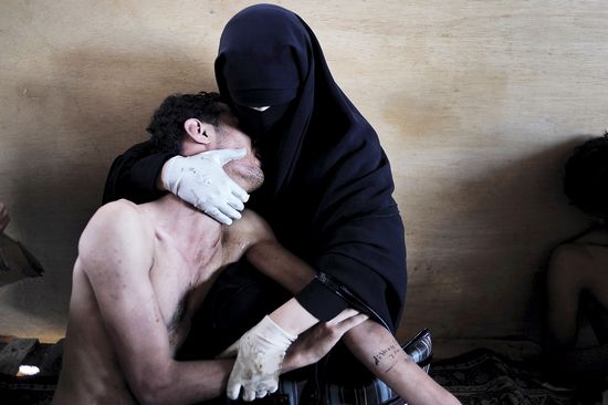 西班牙攝影師塞繆爾·阿蘭達在也門首都薩那拍攝的照片“懷抱受傷親人”獲得荷賽年度照片獎。畫面中,一名身穿黑色罩袍的女子懷抱一名在武裝沖突中受傷的男性親屬,散發著一種寧靜的浪漫主義色彩。新華社發
