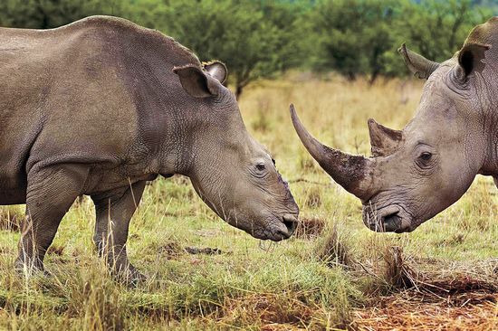 南非攝影師布倫特·斯特頓在南非科倫索拍攝的照片“犀牛之戰”獲得荷賽自然類組照一等獎。畫面上的雌犀牛2010年11月9日被偷獵者割走犀牛角之后逃脫,現在與雄犀牛在一起。新華社/EPA歐新