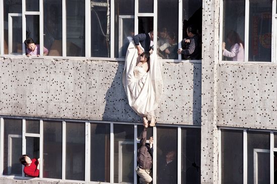中國攝影師李楊拍攝的照片《跳樓新娘》獲得熱點新聞類單幅三等獎。這張照片說明為“2011年5月16日,人們在吉林長春一棟居民樓解救一名身著婚紗意欲跳樓輕生的女子”。新華社發