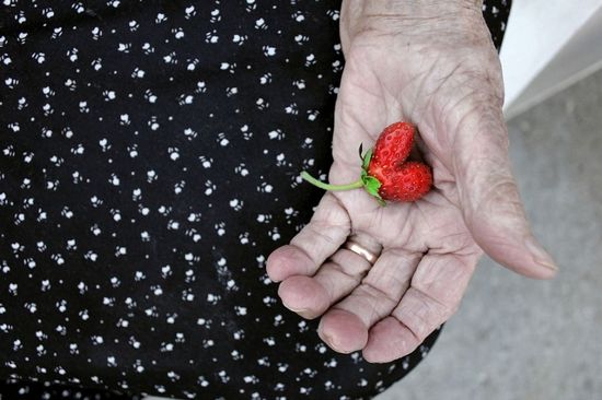 老奶奶和草莓:照片的作者紹博介紹稱,這是我的老奶奶,她的手心里放著一個心形的草莓。愛,通過這一瞬間得到了永恒的傳遞。作品拍攝于匈牙利久洛市。