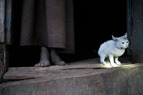 巴萊山的黃昏:在埃塞俄比亞東南部的巴萊山腳下,一只貓和一位年長的婦女正站在自家的門檻前。