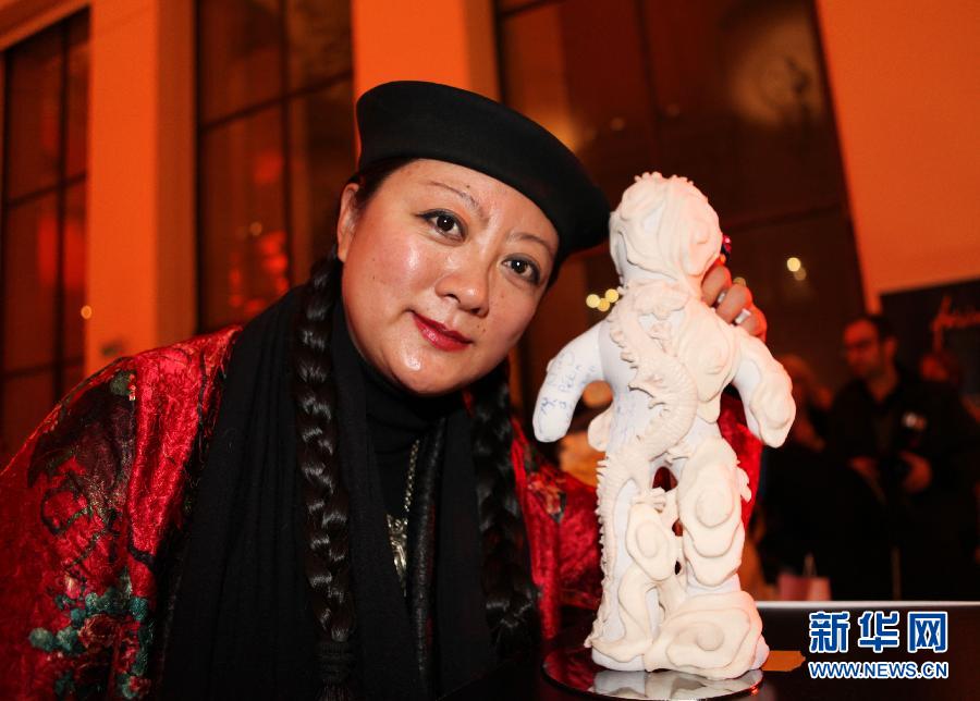 11月28日,在法國巴黎小皇宮舉行的聯合國兒童基金會名師設計布娃娃展上,中國設計師許茗展示她設計的祥云娃娃。