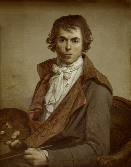雅克·路易·達維特Jacques Louis David (1748-1825) 法國大革命時期的杰出畫家,新古典主義的代表人物。出身于巴黎一個中產階級家庭,1758年 父親去逝,由其叔父和建筑師德麥戎撫養。他最初的繪畫老師是他的親戚,著名的羅可可畫家布歇。之后于1766年和皇家繪畫雕刻學院歷史畫家維恩學畫。從皇家美術院畢業后獲羅馬大獎,得以赴意大利游學,深受意大利文藝復興美術影響。回到法國后,他接受了狄德羅的思想,反對封建王朝的腐朽統治。1794年7月,拿破侖發動政變,因參加了雅各賓黨的達維特,被羅列了17條罪狀而被捕入獄,險遭殺身之禍。1799年,成為拿破侖的首席宮廷畫師。同時期教出一批優秀的畫家,如:·安格爾、柯羅、席拉爾等。1825年,客死異鄉,享年77歲。主要作品:《馬拉之死》《巴利斯和海倫的愛》《被維納斯解除武器的馬爾斯》《荷拉斯兄第的宣誓》《馬拉之死》《描繪美女康貝士貝的阿貝勒士》《拿破侖加冕式》《薩賓女人》《蘇格拉底之死》。