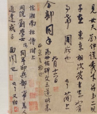 “金部同年,載喜披風(fēng),甚慰私抱,殊爲(wèi)款曲。旋值睽離,必然來晨朝車行邁,適蒙示翰,愈傷老懷,惟冀保愛也。萬萬,不勝消黯。見(現(xiàn))女夫劉仲謨秀才並第二兒子在東京,相次發(fā)書去。如有事,希圖庇也。建中簡上,金部同年,9月16日。《湯世帖》碑文三道,略表西京之物也。《懷湘南》拙詩,附上同院劉學(xué)士騭。同年邵兵部,希差人通達(dá),或與面聞也。建中又白。”