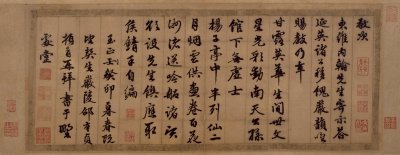 敬次東維內翰先生寄示答延英諸公,移饋嚴韻,唯賜教乃幸。甘露英華生間世,文星光彩動南天。公孫館下無虛士,楊子亭中半列仙。二月煙云供畫卷,百花洲渚送吟船。諸賢欲設先生饌,應取侯鯖手自編。至正壬(此字點去)癸卯暮春既望,契生嚴陵邵亨貞頓首再拜,書于野處堂。