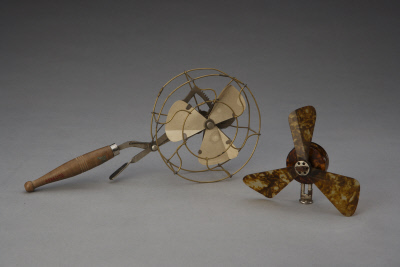 該風扇為手柄連接一體式的玩具小風扇,手柄為化學制品,扇頁為玳瑁材質。扇頁的背后標有“英格蘭制造”字樣。