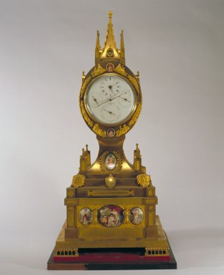 鐘體造型為歐洲古典建筑風格。其機械裝置放在底層方形箱內。箱的前面有抽屜,放置刀、剪、尺、筆、望遠鏡、瓶子等十件小型用具。