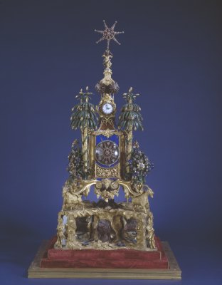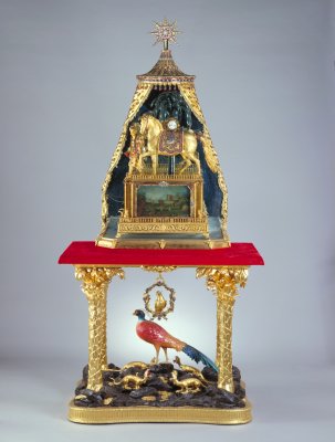銅鍍金雉雞山石騎士牽馬表,英國詹姆斯·考克斯制造,高238cm,長114cm,寬71cm。清宮舊藏。