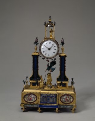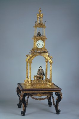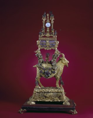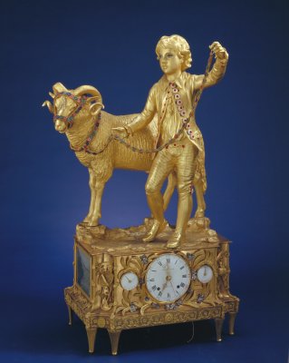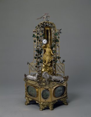 此鐘充分利用機械齒輪的聯動,啟動音樂裝置后,所有的轉花隨之轉動,使人眼花繚亂。將底足做成動物形來支撐鐘體是18世紀英國鐘表慣用的手法,常采用的動物形象有羊、象、獅子、犀牛等。