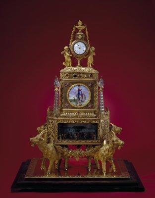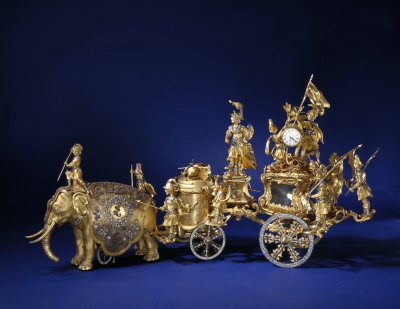 此鐘造型是一只健碩的大象拉著四輪戰車,戰車與象背上共載官兵11人。象及車身為銅鍍金嵌玻璃。此樂鐘為英國制造,時間應在1770年左右。