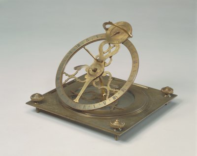 銅鍍金赤道式日晷,18世紀,英國制造,地平盤邊長25cm。清宮舊藏。