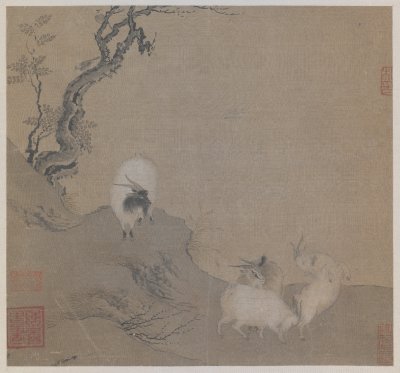 《四羊圖》頁(yè),南宋,陳居中作,絹本,設(shè)色,縱22.5cm,橫24cm。