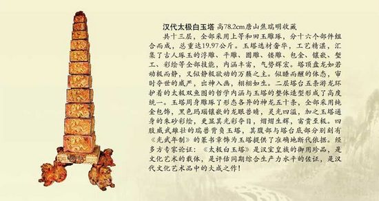 由聯合國千年發展目標公益主題活動中國組委會、中國智慧工程研究會、中國收藏家協會玉器收藏委員會評選的“民間十大國寶”在北京飯店寶石廳展出。有新石器時期玉制兔首骨骸、綠松石骷髏頭、2395片滿工陽刻紋案的周代玉衣、約7萬克拉的唐代碧璽貓眼貢珠、漢代黃玉雕鴻門宴、漢代白玉馬踏飛燕、清乾隆羊脂白玉橋型筆架、漢代黃玉車馬、漢代太極白玉塔、戰國青銅鎏金嵌寶石吊壺、清乾隆琺瑯彩瓷孔雀等,堪稱中國古代藝術品中的極品。