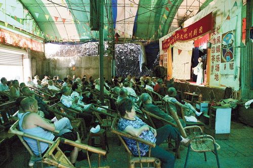 戲依然演著,鏗鏘的鑼鼓聲蓋過一切現實的煩擾。隱約透過防水編織布或廣告布的縫隙,看到里面已坐滿了人,清一色的年逾花甲的老人,穿著夏日的薄衫,搖著蒲扇,眼睛出神地望著臺上,循著那目光望過去,身著戲服的演員們說著戲里的話,演著戲里的故事。簡陋的布景無法阻礙他們注入真實的情感,雖然要一人分飾多角,要幫腔,甚至時不時要演出變臉、吐火等絕技,然而在各色的臉譜下掩不住的,是那一抹川劇人對傳統文化的虔誠。