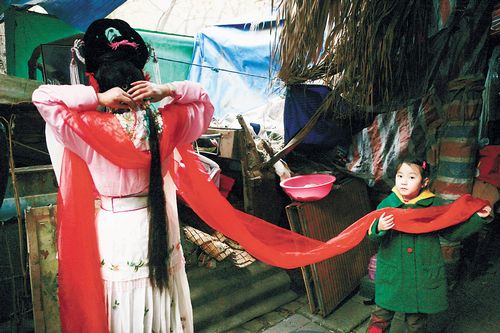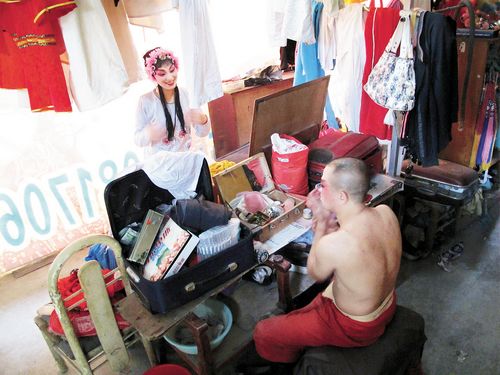 撩開簾子便來到后臺,演員們正在化妝,穿著劇中某個朝代的服裝,臉上畫著一個經典故事里的人物臉譜;一頭華麗的珠花伴著滿面俏麗的妝容,身著的是發黃的T恤衫……站在露天的化妝間里,感受到的是他們的氣息和屬于他們的真實。戲裝、靴子、頭花或者散落在桌子上的粉盒和油彩……雖然凌亂但是又如此和諧,夏日陽光穿透帳篷斜射進來,與里面的道具、演員相互映照著,讓人感覺到他們現在的生活,很辛苦、很“落伍”,但是他們仍舊樂觀。