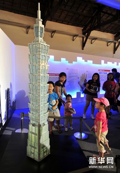 (1)7月14日,參觀者在“積木夢工場”欣賞“臺北101大樓”積木藝術作品。