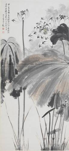張大千在花鳥畫上的造詣,不僅來自對古人的追摹,更來自于對各種花卉的養殖和深入觀察,以及對古代有關畫譜的爛熟于心。 “田田翠蓋凈無塵,綠水琉璃一槳新。欲唱采蓮迷近遠,不知何處是花身。”張大千的荷花別有一番風味,本幅未署年款,從風格上推斷應屬早期之作。此件《荷花》以率意的大寫意手法寫荷葉,縱筆揮灑之后,經過層層暈染再以淡赭入墨,使之更有精神更具立體感。荷花從荷葉中探出,燦然盛開,花瓣僅以筆墨勾勒,柔美又富有韻致的線條尤顯得花瓣素凈,再加之大片荷葉的襯托,愈顯得荷花高潔。荷桿在畫中也尤為重要,等于房子的梁柱,畫時從上到下,頓挫有勢,亭亭玉立,桿上再打點,上下交錯,左右揖讓。荷桿的周圍,張大千別有用心的再添上幾筆水草,更顯畫面的豐富與生動。 張大千欣賞荷花猶如欣賞美人,能將那些不易察覺的幽韻盡收筆底,此幅《荷花》即是如此,好似一位不施脂粉的絕世美人,靜靜等待哪位識者將其納入畫閣而寶藏。