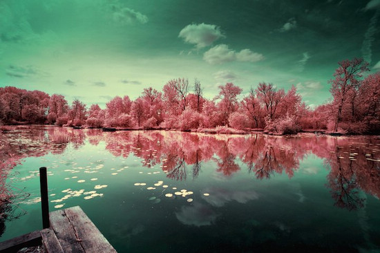 攝影師David Keochkerian的紅外攝影中,自然景觀中最熟悉的青蔥翠綠不見了,取而代之的是一片斑斕。通過紅外攝影技術的修改,天空和湖面在絢爛色彩的襯托下更顯別出心裁。