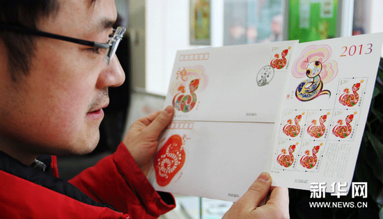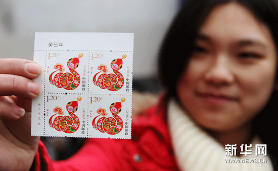 2013年1月5日,中國郵政集團公司發行《癸巳年》生肖“蛇”郵票。該套郵票1套1枚,面值1.20元。新華社發(朱桂根 攝)