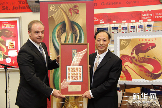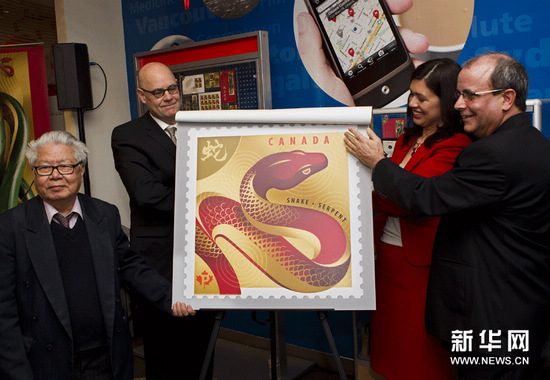 當日,為迎接中國農歷癸巳蛇年,加拿大郵政總局正式發行蛇年生肖郵票,包括首日封、紀念封、國內及國際版郵資郵票等。2013年的蛇年生肖郵票由加拿大設計師喬·高爾特和阿維·鄧克爾曼設計。國內郵資版的圖案是一條金色鱗紋的赤蛇;國際郵資版的圖案是一條綠色玉蛇盤繞成“8”字。加拿大郵政總局于1997年開始發行中國生肖郵票。新華網圖片 黃曉南 攝