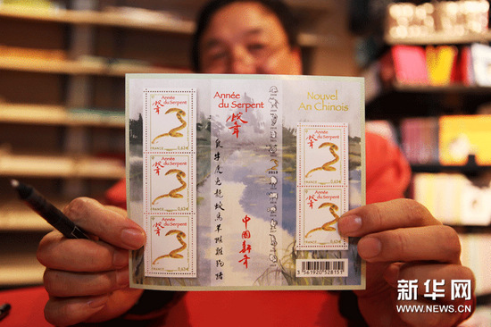 為迎接中國農歷新年的到來,法國郵政總局當日在巴黎發售中國蛇年生肖紀念郵票。2005年,法國郵政總局首次發行了由旅法華裔藝術家李中耀與法國藝術家合作完成的中國農歷雞年生肖紀念郵票,此后又陸續發行了狗年、豬年、鼠年、牛年、虎年、兔年、龍年生肖紀念郵票,吸引了大批集郵愛好者踴躍購買。新華社記者高靜攝