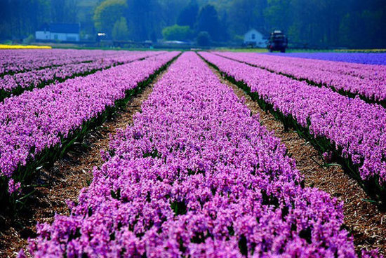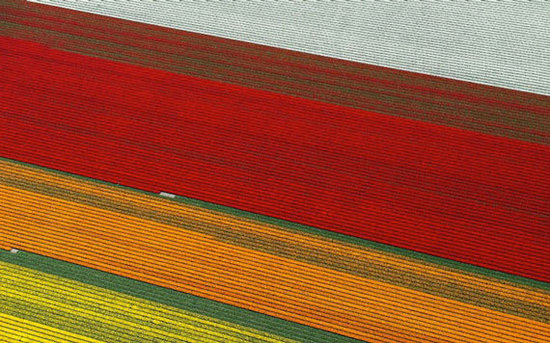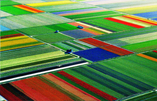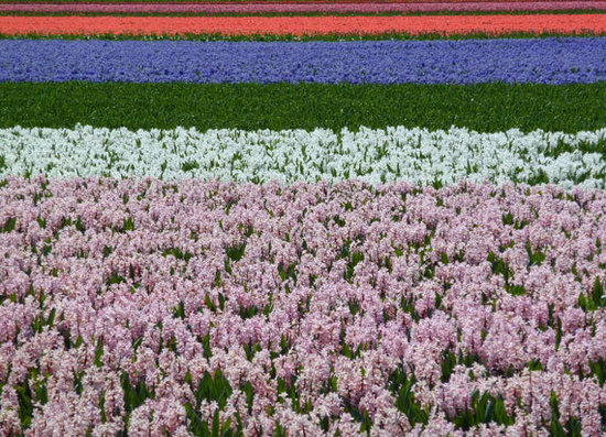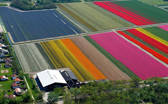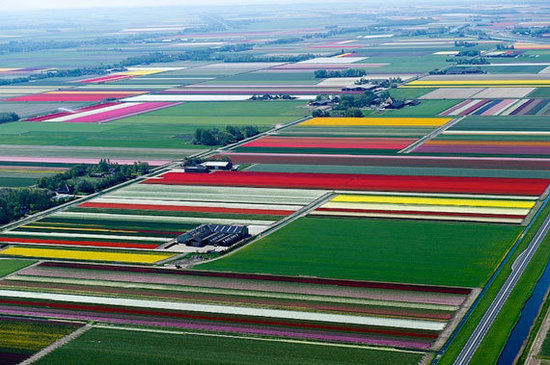 在彎彎曲曲的自行車專用道上緩慢騎行,靜靜的郁金香花田就在眼前,偶爾吹來一陣春風,滾起一道道縱橫幾十里色彩鮮艷的花之彩浪,把淡淡醉人的郁金香芬芳送入鼻息,沁人心脾。從阿姆斯特丹史基浦機場起降時,透過舷窗觀望,一望無際的各色郁金香花田,仿佛給大地披上了一片片五顏六色的地毯,在蔚藍的蒼穹下,呈獻一幅遼闊壯麗、耀眼斑斕的自然之美。五彩的花田,繽紛綻放,荷蘭的春天就是這般美麗。
