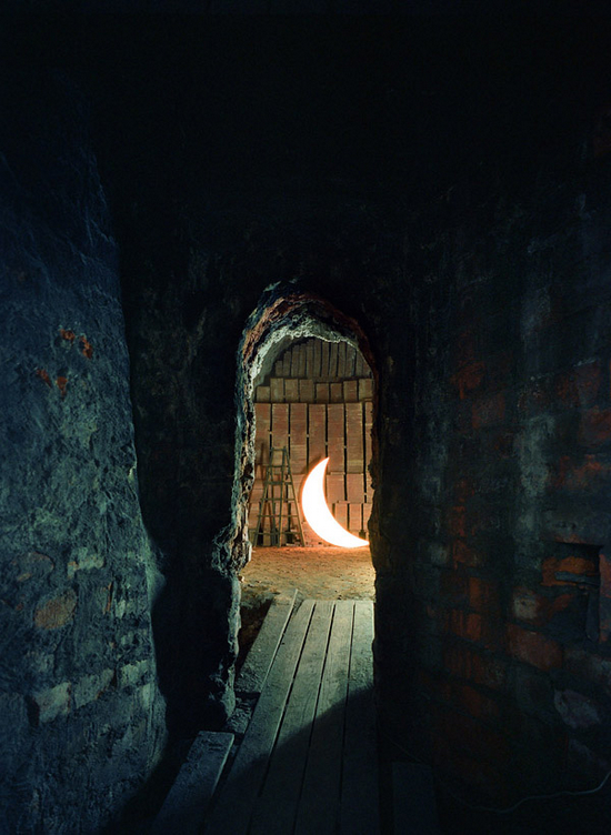 在這個系列裝置藝術作品中,他使用LED技術制作了巨型彎月,在夜晚發出明亮而均勻的光芒,創造和照亮了一個個充滿著夢幻色彩的場景。他們利用這一系列名為私人月亮(Private Moon)作品講述了一個故事:一個男人偶然間發現了月亮 ,一見鐘情,并最終如影隨行、與她共度余生。這儼然是一個荒誕不經的童話,但漂亮的視覺效果中也突顯出神秘、浪漫的氣氛。