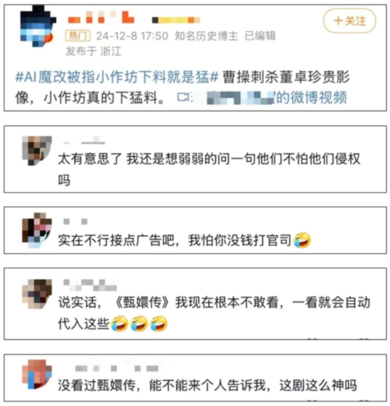 這些短視頻在博得網(wǎng)友一樂的同時,也收獲了不少粉絲。據(jù)媒體報道,有的自媒體,用AI做了42個“魔改”《甄嬛傳》的視頻,捕獲了18萬粉絲;某平臺上的一個“魔改”《甄嬛傳》短視頻,獲得點贊26.3萬、轉(zhuǎn)發(fā)56.4萬,視頻還插入了廣告;在“魔改”熱度的推動下,平臺上也出現(xiàn)了大量如何用AI“魔改”影視作品的教程。
