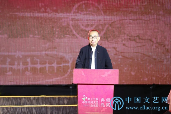 潘魯生在頒獎典禮上致辭。他表示,當前全社會對于中華優秀傳統文化的認同與傳承進一步深化,還將帶動一系列文化事業、文化產業的創新實踐。民間文藝不斷融入生活潮流,將使優秀的文化傳統更加富有活力。民間文藝也只有以人民為中心、只有如山花遍野充滿生機,才能迎來文藝百花園的欣欣向榮。