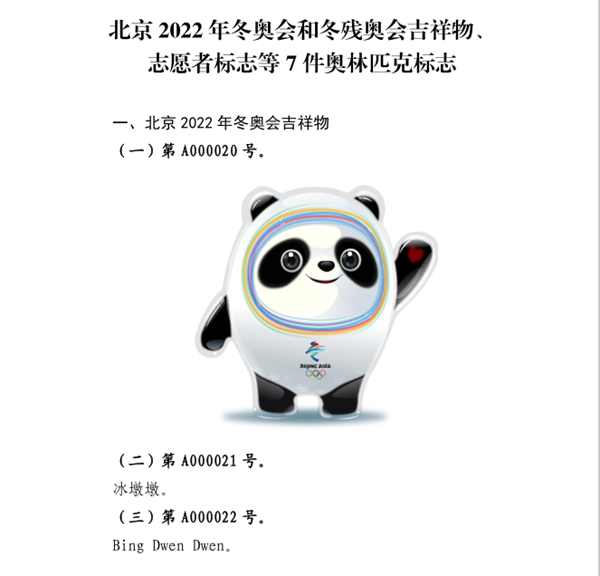根據《奧林匹克標志保護條例》的規定,北京冬奧組委將冰墩墩形象及名稱提交國家知識產權局進行公告。