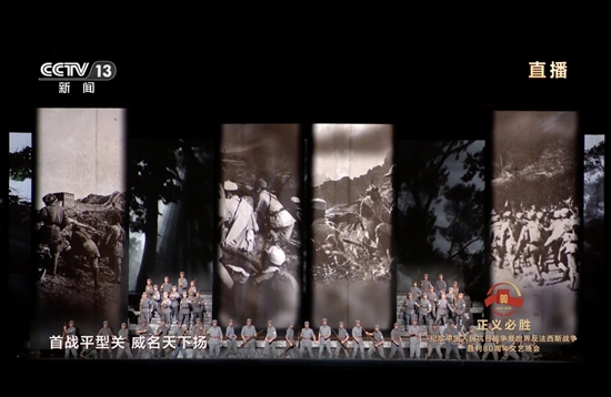 在紀念中國人民抗日戰爭暨世界反法西斯戰爭勝利80周年的時代節點,回望歷史、致敬經典是必不可少的一環。楊帆介紹,《正義必勝》中,經典與新作的比例大致為7:3,從開篇時《松花江上》的沉痛追憶、《黃河大合唱》的振奮鼓舞、老詞新曲再作詮釋的《露營之歌》,到地域特色濃郁的陜甘寧民歌《東方紅》《高樓萬丈平地起》,從接連唱響的《八路軍軍歌》《瓊崖獨立隊之歌》《地道戰》《游擊隊歌》《彈起我心愛的土琵琶》《在太行山上》,到真情縈繞的《我愛你,中國》,銘刻著民族記憶的旋律一直都在回響,最終,晚會在《勢不可擋》《命運與共》兩首新作的強音中落幕,發出對時代、對世界的深情關懷。