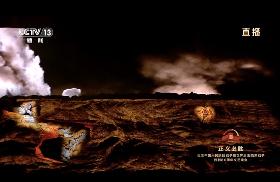當演員沉重地“跌入”臺階之間的裂隙,形成令人心痛的南京大屠殺“萬人坑”場景;當投影在演員的身上投射出干涸的大地,炮火讓大地撕開血口……文藝晚會《正義必勝》中,多種視覺特效構成的舞美效果感動了無數觀眾。本場晚會視覺總監任冬生在接受本報記者獨家采訪時,講述了視覺團隊如何締造這些震撼場面。