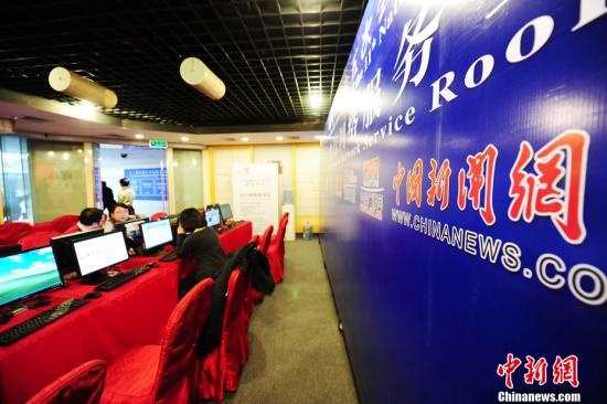 走扶手樓梯到二層后直行幾米便是“電信網絡服務室”,記者的前期采訪準備和后期寫作編輯可在這里進行,室內一面設計緊湊的背景墻上印有“中國新聞網”、“人民網”、“新華網”等主流新聞網站的標示,22臺電腦提供免費上網服務。