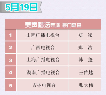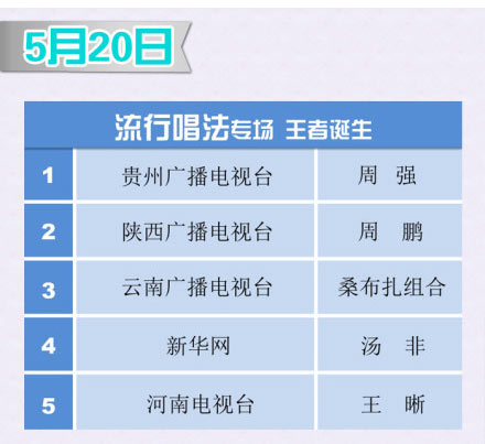 藍色經典?天之藍第十五屆青歌賽史上最激烈的青歌賽決賽即將到來!5月18日民族組高手過招,5月19日美聲組強者比拼,5月20日流行組王者爭雄。三場專場比賽,各唱法5強選手將使出渾身解數,高歌猛進!每晚19點30分,盡情享受青歌賽為您帶來的饕餮盛宴。巔峰總決賽,見證歌者加冕時刻!