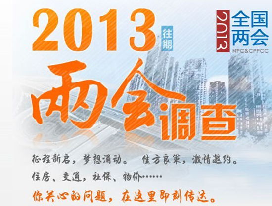 截至3月3日零時調查結束,共有1248670人次的網民參與兩會調查投票,“社會保障”獲最多的256458張票,得票率為20.5%,“收入分配”和“反腐倡廉”分別得票182693張和180876張,得票率分別為14.6%和14.5%,位列二三位。除前三甲之外,最關注問題依次是“住房保障”、“醫療改革”、“穩定物價”、“食品藥品安全”、“法治中國”、“行政體制改革”和“國防建設”。