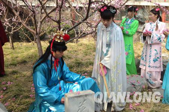 千龍網記者在大觀園清明節特色活動彩排現場看到,身著古裝的“”肩擔花鋤,手持花帚,繞過山坡款款而來,“寶玉”陪伴“黛玉”走到桃花樹下,他們一起把繽紛的落英裝進花囊里,葬在花冢下。這凄美動人的一幕引得園內游客紛紛駐足。