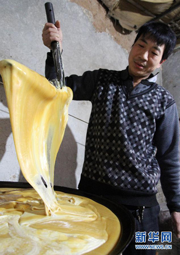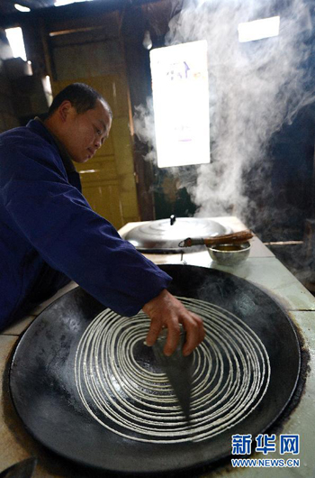 湖北省宣恩縣上湖塘村村民在烙“豆皮”(1月26日攝)。 2月3日是農(nóng)歷臘月廿三,民間俗稱“小年”。節(jié)日臨近,湖北省恩施土家族苗族自治州各地群眾按照傳統(tǒng)習俗備年貨,糍粑、豆皮、包谷糖等帶著濃濃土家“年味”的特色食品,是當?shù)厝罕姷谋貍淠曦洝P氯A社發(fā)(宋文 攝)