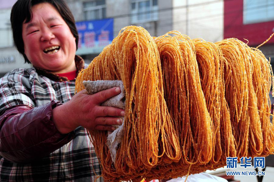 2月1日,山東省臨沂市郯城縣馬頭鎮(zhèn)一家老字號食品店的工作人員在展示剛出鍋的油炸馓子。 2月3日是農(nóng)歷臘月廿三,民間俗稱“小年”。郯城縣有“小年來到炸馓子放炮”的傳統(tǒng)習俗。當?shù)乩献痔柺称返甑膫鹘y(tǒng)食品油炸馓子很受歡迎,人們紛紛選購以備“小年”這天款待客人、饋贈親朋。新華社發(fā)(房德華 攝)