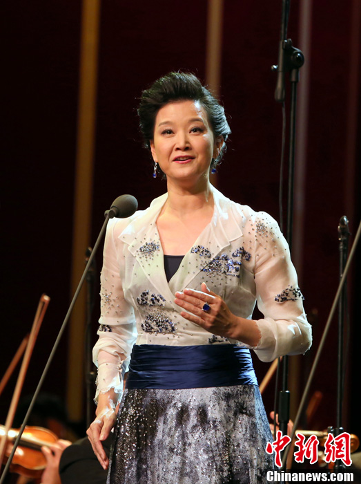 12月25日,宋祖英演唱歌曲。當晚,《人民的毛澤東》紀念毛澤東誕辰120周年音樂會在國家大劇院舉行,上千名首都各界群眾共同觀看了這臺音樂會。中新社發 李慧思 攝