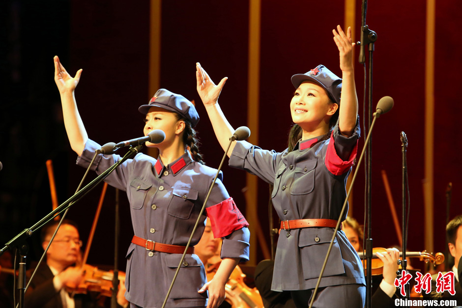 12月25日,身著紅軍服裝的歌唱演員演唱歌曲《紅軍想念毛澤東》。當晚,《人民的毛澤東》紀念毛澤東誕辰120周年音樂會在國家大劇院舉行,上千名首都各界群眾共同觀看了這臺音樂會。中新社發 李慧思 攝